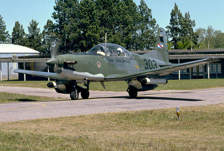 Pilatus PC-7 FAU 303 armado con pods con ametralladoras MAG 7.62 y lanzacohetes de 2.75"